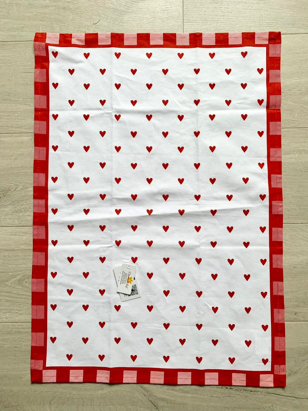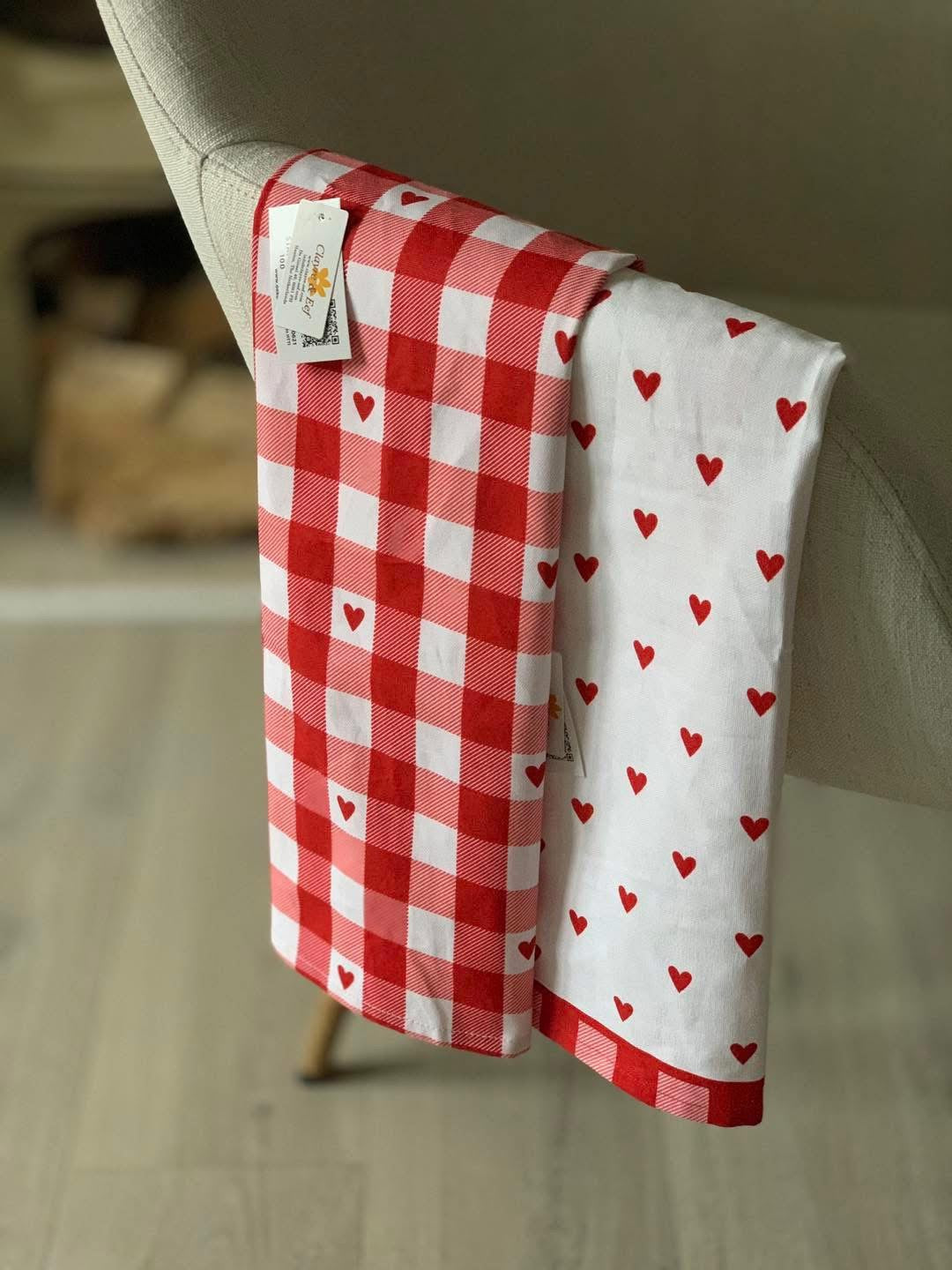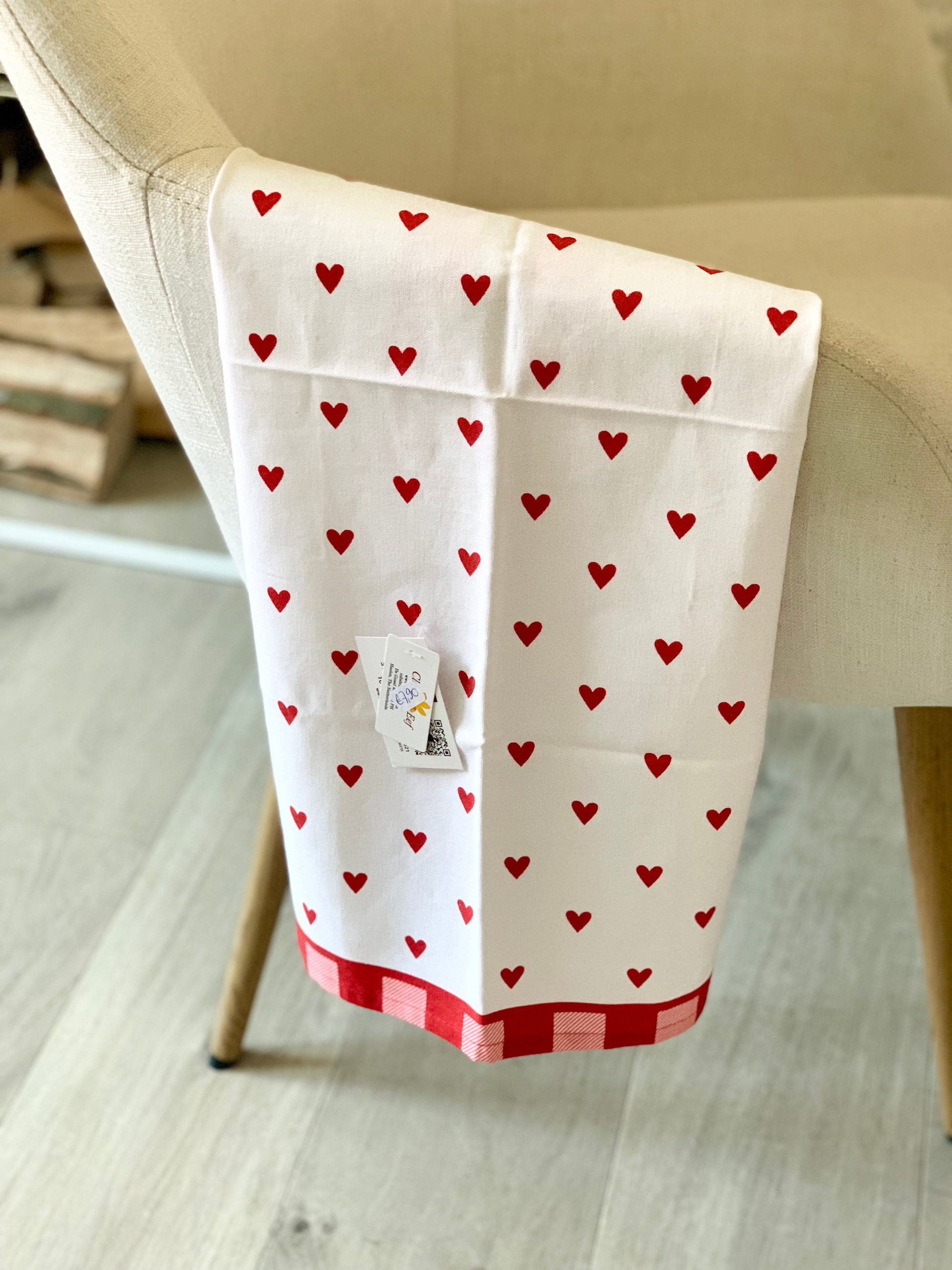 Essuie de cuisine avec coeurs rouges sur fond blanc